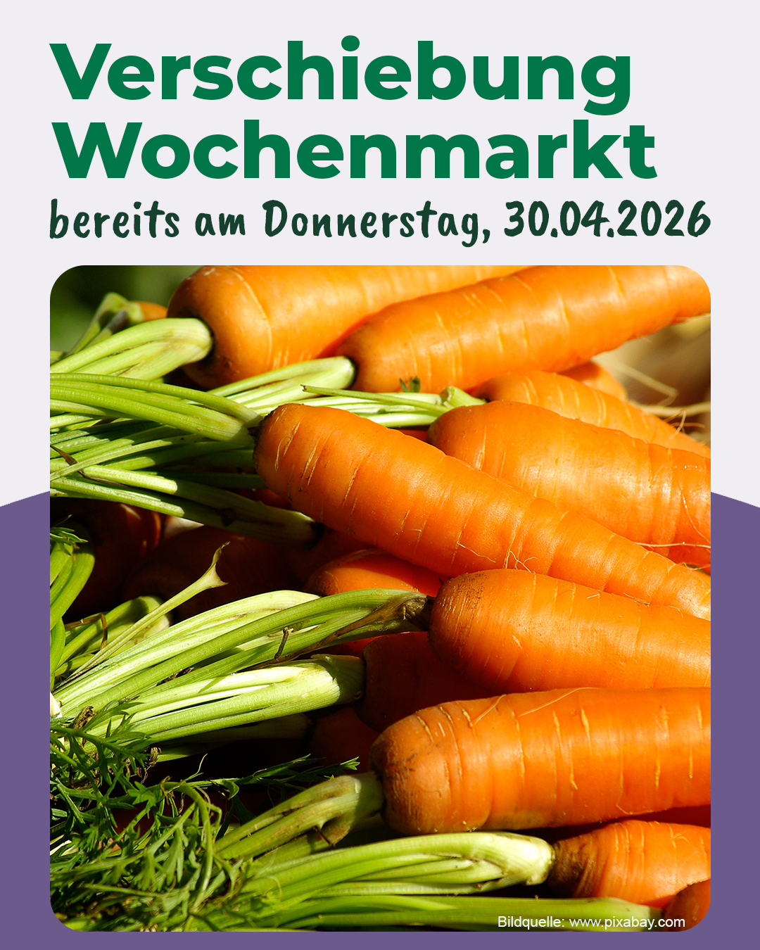 Unser Wochenmarkt ist auch in der kommenden Woche für Sie da, dann allerdings bereits einen Tag früher als gewohnt: